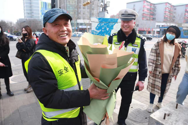 After the identities of several people involved in the rescue were confirmed one after another, on the morning of February 28th, the policemen of the traffic police brigade of Lixia District accompanied the rescued owner, Ms. Liu, to the intersection of Lishan Road, Huayuan Road, and thanked Chen Junbo who was on duty here and Sun Qi who worked nearby. Ms. Liu sent flowers to Chen Junbo and Sun Qi, thanking them for their heroic rescue, protecting their own safety and reducing property losses. Li Zhichao sent a thank-you letter on behalf of the Traffic Police Brigade, saying, "It was their heroic responsibility and heroism that effectively curbed the spread of the fire, protected people’s lives and property, and avoided traffic congestion on a large scale. In just a few minutes, a’ textbook’ rescue operation was staged! "